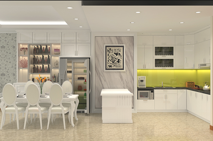Trong một không gian hiện đại sang trọng với gam màu sáng trắng làm tổng thể căn phòng nổi bật với những chậu hoa, bức tranh dán tường và màu xanh nổi bật của kệ bếp. Tổng thể không gian gam màu sáng thoáng mát sự kết hợp các vật dụng như bàn ghế ăn tân cổ điển kệ bếp đều đạt đến độ tinh tế vừa mang phong cách hiện đại nhưng lại pha lẫn một chút cổ điển.